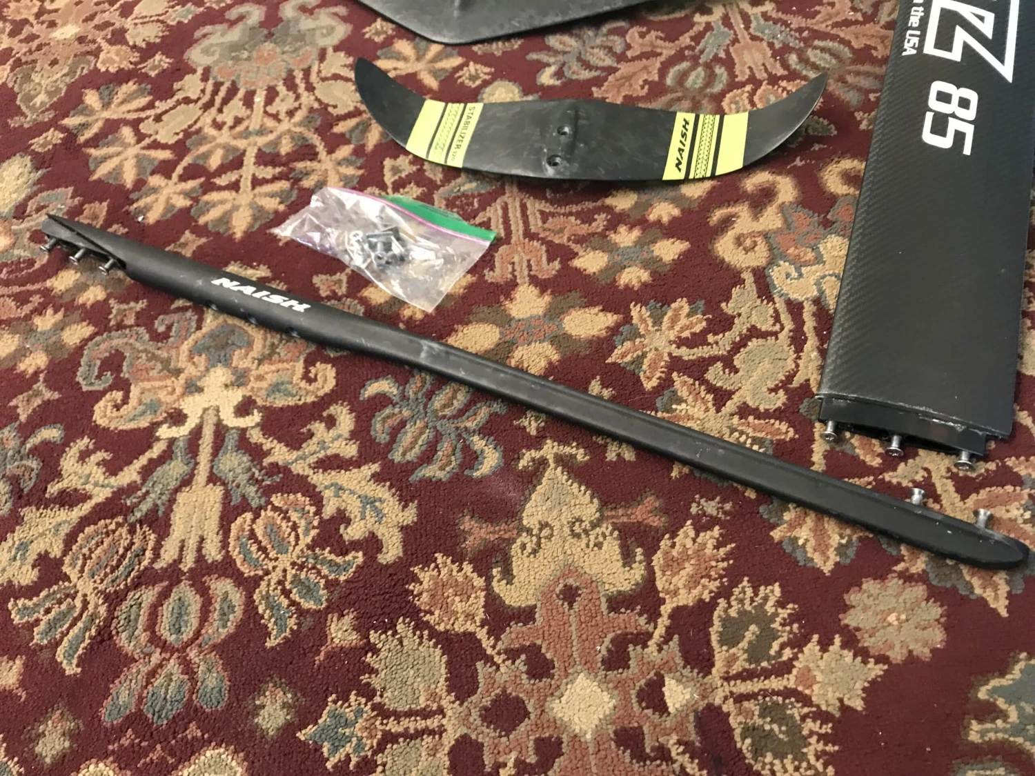 “B” condition. This used Naish 1150 windsurf foil package includes a major upgrade. Specifically, a Nolimitz 85 cm carbon foil mast. The mast alone retails for $1,200. The package also includes all hardware, a Naish Torx tool, and Naish carrying sleeve — everything to get you flying high. Ships by quote.